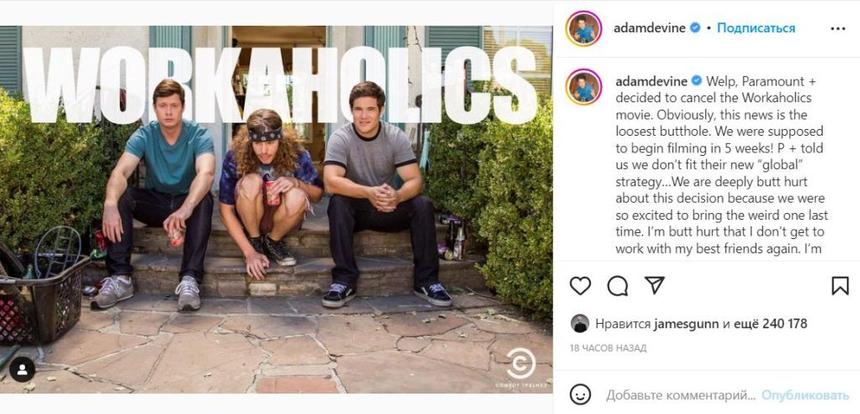 «Что ж, Paramount+ решил отменить фильм „Трудоголики“, — написал Дивайн. — Мы должны были начать съемки через пять недель! Нам сказали, что мы не вписываемся в их новую глобальную стратегию. Мы глубоко обижены этим решением, потому что очень хотели в последний раз придумать что-то странное».