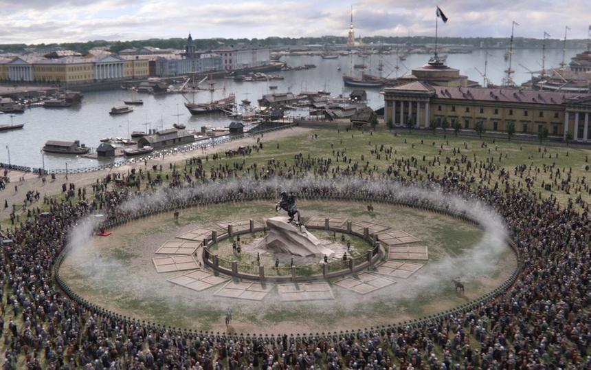 Одна из самых масштабных и живописных сцен фильма посвящена открытию памятника Петру I